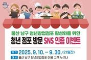 코리아타임뉴스 울산취재본부 | 울산 남구는 청년창업점포 지원과 지역상권 활성화를 위해 ‘2025년 청년창업점포 지원사업’참여업체 39개소를 대상으로 방문인증 이벤트를 진행한다. 남구에 따르면 이번 이벤트는 9월 10일부터 9월 30일까지 진행되며 청년창업점포 방문인증 사진을 개인 사회관계망(SNS)에 올리고 매장 안에 비치된 큐알코드로 이벤트에 참여할 수 있다. 행사 종료 후 추첨을 통해 참여자 중 200명을 선정해서 모바일 커피상품권(1만원권)을 문자메시지로 발송한다. 자세한 내용은 남구 일자리포털 누리집에서 확인할 수 있고 기타 문의사항은 일자리청년과로 문의하면 된다. 서동욱 남구청장은 “이번 행사를 통해 지역의 청년 점포를 알리는 데 실질적인 도움이 되길 기대하며, 앞으로도 청년창업 점포의 활성화와 매출 증대를 위해 다양한 지원방안을 강화하겠다”고 전했다.