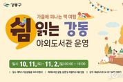코리아타임뉴스 윤경수 기자 | 강동구는 10월 11일부터 11월 2일까지 한 달간 파믹스가든(상일동 145-6)에서 주말 야외 도서관 '쉼 읽는 강동'을 운영한다고 밝혔다. ‘가을에 떠나는 책 여행’이라는 주제로 열리는 이번 행사에는 행사 기간 매주 토요일 ‘기억 쉼’, ‘일상 쉼’, ‘웰니스 쉼’, ‘함께 쉼’을 테마로 프로그램을 운영한다. 10월 11일(기억 쉼) 프로그램으로는 거북선 만들기 등의 체험과 ‘최강보 아티스트’의 비눗방울 마술공연이 진행된다. 특히, 이날 오전 10시에는 ‘큰별쌤’ 최태성 강사의 특강이 함께 진행되어 행사의 첫날을 빛낼 예정이다. 10월 18일(일상 쉼)에는 손수건 만들기 등의 체험과 그림책 독서와 원예 활동을 접목한 ‘그림책 가드닝’ 등의 프로그램이 운영된다. 10월 25일(웰니스 쉼)에는 자연을 탐구하는 프로그램이 진행된다. 꽃·나뭇잎 등으로 책갈피를 만드는 체험은 물론, 숲 해설가와 함께하는 자연 관찰 프로그램인 ‘그림책 숲 해설’이 진행된다. 11월 1일(함께 쉼)에는 샌드위치 만들기 프로그램을 비롯해 참여자가 직접 중고책을 플리마켓을 운영하는 참여형 프로그램들이 진행된다.