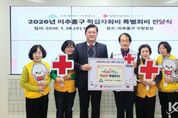 코리아타임뉴스 이아름 기자 | 인천 미추홀구는 28일 구청장실에서 대한적십자사 인천지사(회장 조의영)와 적십자봉사회 미추홀구협의회(회장 조혜정) 등이 참석한 가운데 적십자 특별회비 200만 원을 전달했다. 이날 전달된 특별회비를 포함한 적십자회비는 재난 발생 시 이재민 구호 활동, 취약계층 및 복지 사각지대 위기가정 지원 등 각종 인도주의 활동에 사용될 예정이다. 이영훈 구청장은 “지역 곳곳의 소외된 이웃에게 희망을 전하는 의미 있는 일에 동참할 수 있어서 기쁘다.”라며, “지역사회에 따뜻한 기부 문화가 널리 퍼질 수 있도록 함께 노력하겠다.”라고 말했다. 한편, 구는 매년 지역사회 소외계층을 돕기 위해 적십자 특별회비 납부에 동참하고 있으며 이를 통해 지역 내 어려운 이웃들에게 실질적인 도움을 주고 있다.