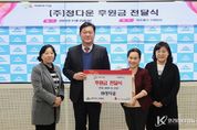 코리아타임뉴스 이아름 기자 | 인천 미추홀구는 지난 25일 구청장실에서 사회적기업 ㈜정다운(대표 장옥순)으로부터 지역사회 나눔 실천을 위한 성금 300만 원을 전달받았다. 전달된 성금은 인천사회복지공동모금회를 통해 관내 저소득 가정 등 취약계층을 지원하는 데 사용될 예정이다. 장옥순 대표는 “지역사회에 조금이나마 보탬이 되고자 성금을 기부하게 됐다.”라며, “앞으로도 지속적인 사회공헌활동을 통해 지역과 함께 성장하겠다.”라고 전했다. 이영훈 구청장은 “어려운 이웃을 위한 따뜻한 나눔에 깊이 감사드린다.”라며, “후원해 주신 성금은 도움이 필요한 대상자에게 투명하고 신속하게 전달하겠다.”라고 말했다. 한편, 구는 앞으로도 민관 협력을 기반으로 취약계층 지원 및 복지 강화에 최선을 다할 계획이다.