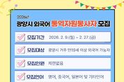 코리아타임뉴스 전남취재본부 | 광양시는 각종 축제와 국제행사에서의 통역 지원과 외국인 민원 안내 등 다양한 분야에서 통역 봉사에 참여할 시민 외국어 통역자원봉사자를 2월 9일부터 2월 27일까지 모집한다고 밝혔다. 모집 대상은 공고일 기준 광양시에 거주하는 만 19세 이상 시민으로, 영어·중국어·일본어를 비롯한 기타 외국어 구사가 가능하면 누구나 신청할 수 있다. 선발된 통역자원봉사자는 매화축제 등 광양시 주요 축제와 각종 대형 행사에서 외국인 대상 현장 안내 및 통역을 지원하게 되며, 관내 기관·업체 협조 요청에 따른 통역 지원, 외국인 관광객 및 광양시 거주 외국인을 대상으로 한 안내·민원 협조 등 다양한 활동을 수행하게 된다. 시는 통역자원봉사자에게 자원봉사 실적 입력 및 관리 서비스를 제공하고, 활동 우수자에 대해서는 표창 또는 감사패 수여, 향후 광양시 명예통역관 위촉 시 우선 고려하는 등 인센티브를 제공할 계획이다. 아울러 국내 통·번역 특성화 대학과 연계해 통역자원봉사자의 전문성을 높이기 위한 온라인 통역 교육도 운영할 예정이다. 신청은 시 누리집 공고·공지사항에서 신청서를