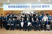 코리아타임뉴스 전북취재본부 | 완주군시설관리공단이 12월 31일, 완주군시설관리공단 2층에서 2025년 을사년 종무식을 열고, 지난 1년간의 성과를 돌아보며 새로운 도약을 다짐했다. 이날 종무식은 유희태 완주군수, 유의식 완주군의회 의장, 군 유관부서, 공단 임직원 등 주요 내외빈이 참석해 공단의 2025년을 함께 돌아봤다. 행사는 성과 영상 상영으로 시작해 군수, 군의장 및 이사장 송년사, 유공 직원 표창 순으로 진행됐으며, 공단 구성원들의 열정과 노력을 되새기고 지난 1년간 공단이 걸어온 발자취와 미래 비전을 함께 공유하는 뜻깊은 시간이 마련됐다. 완주군시설관리공단은 2024년 10월 출범 이후 ▲공영마을버스 ▲고산자연휴양림 ▲공설장사시설 ▲공영주차장 ▲종량제봉투 판매사업 등 주요 수탁사업을 안정적으로 운영하며 군민 생활과 밀접한 공공서비스의 질을 높이는데 주력해 왔다. 특히 출범 초기의 조직 안정화, 근무체계 정립, 대민 서비스 개선 등 다양한 혁신적인 노력을 통해‘군민 가까이, 군민 중심의 공단’으로 자리매김하고 있다. 2026년에는 완주군으로부터 4개시설(삼례청소년수련관, 봉동