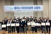 코리아타임뉴스 한장선 객원기자 | 현원돈 제주시 부시장은 27일 평생학습관 대강당에서 열린 ‘제4기 제주시 주민자치대학 수료식’에 참석해 교육과정을 마친 수료생들에게 축하의 인사를 전했다. 이날 수료식에서는 지난 6월부터 9월까지 4개월간 주민자치대학에서 ▲기본소양(지역문제 갈등관리 및 해결과정ㆍ제주 이해를 위한 미술관 속 세계여행), ▲지방자치(제주의 지속가능발전 목표ㆍ주민자치회 도입과 주민자치 우수사례 등), ▲실무역량(Chat GPT 이해와 주민자치 활용ㆍ주민자치 퍼실리데이터 교육 등), ▲워크숍 등의 교육을 이수한 33명에게 수료증이 전달됐다. 한편, 이번 주민자치대학은 (사)한국지역혁신연구원에 위탁해 제주특별자치도 소통협력센터에서 15주 동안 매주 목요일 오후 6시 30분부터 2시간 교육을 진행했다. 현원돈 제주시 부시장은 “이번 교육과정을 통해 습득한 지식과 경험이 지역사회 발전에 적극적으로 활용되길 바란다”며, “특히, 제주형 주민자치회 출범 등 주민자치의 새로운 방향을 모색하고 있는 시기에 여러분의 활동이 풀뿌리 민주주의 정착과 주민 주도 자치문화 확산에 큰 힘이 될 것이라 기대한다”고 전했다.