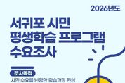 코리아타임뉴스 한장선 객원기자 | 서귀포시는 시민 의견을 바탕으로 2026년도 평생학습 프로그램 편성을 준비하고 분야별 강사를 공개모집하기 위해 온라인 수요조사를 진행한다. 이번 조사는 만 19세 이상 서귀포 시민을 대상으로 9월 15일부터 9월 30일까지 진행되며, 네이버 폼을 통해 간편하게 참여할 수 있다. 서귀포시는 시민 누구나 부담 없이 설문에 참여할 수 있도록 문항을 성별·연령·거주지 등 응답자 정보, 평생학습 참여 경험, 선호 시간대, 원하는 프로그램 유형 등 12개로 간결하게 설계했다. 수집된 결과는 2026년 서귀포시 평생학습관 프로그램 편성과 강사 공모, 읍면동 평생학습센터 운영 등 지역별 평생학습 지원 정책 마련에 활용될 예정이다. 특히 지역에서 활동하는 전문가들의 강사 활동 참여 기회를 확대하고 교육 내용의 다양성과 질을 높이기 위한 강사풀 공개모집의 분야별 인원 배정에도 직접 반영된다. 강사풀 공개모집은 10월 말 예정이며, 세부 내용은 추후 공고될 예정이다. 서귀포시 관계자는 “이번 설문조사 결과를 적극 반영하여 시민의 다양한 요구에 맞춘 평생학습 기회를 제공하겠