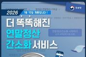 코리아타임뉴스 윤광희 기자 | 더 똑똑해진 연말정산 간소화 서비스 2026년 1월 15일 개통합니다! ■ 더~욱 새로워진 연말정산 간소화 서비스 기존 42개 자료+ 3개 자료 추가 1. 발달 재활 서비스 이용 증명 2. 장애인 활동 지원 급여 본인 부담금 자료 3. 체육시설 이용료 자료 ■ 더~욱 정교해진 소득 기준 초과 부양가족 명단 제공 소득 금액 100만 원 초과 부양가족에 대한 정보 연말정산 간소화 서비스 자료 조회 화면에서 안내 * 근로소득만 있는 경우 총급여 500만 원 - 소득 기준 초과 부양가족 내역 * 자세한 사항은 국세청 블로그를 참고해주세요! ■ AI 전화 챗봇 상담 - 국세 상담센터: ☎126→0번→0번(상담사 또는 AI 상담사 연결) - 세무서: 대표번호→2번→6번(AI 상담사 연결) (AI 상담사) · 주민등록번호 입력 후 본인인증 연말정산 간소화 자료 일괄 제공 현황, 부양가족의 간소화 자료 제공 동의 현황 등 · 생성형 AI 챗봇 상담 시범 운영 경로→홈택스 접속→홈택스 퀵메뉴→챗봇 상담 클릭 *홈택스 ■ 연말정산