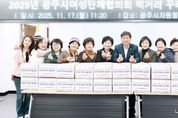 코리아타임뉴스 사회팀 | (사)경기도여성단체협의회 광주시지회는 17일 지역 내 취약계층을 위해 먹거리 꾸러미 40세트를 광주시에 전달했다. 이번 나눔은 지난 11월 장수돌침대에서 기탁한 성금을 활용해 마련됐으며 소머리국·참치캔·미역 등 5만 원 상당의 식료품으로 구성된 꾸러미는 협의회 회원들이 정성스럽게 포장해 사례 관리 및 긴급복지지원 대상 가구에 전달됐다. 양미순 광주시여성단체협의회장은 “다가오는 연말, 도움이 필요한 이웃들에게 따뜻한 마음을 전할 수 있어 매우 뜻깊다”며 “작은 정성이지만 어려운 분들께 힘이 되길 바라며 앞으로도 지역사회의 따뜻한 나눔 문화가 지속될 수 있도록 노력하겠다”고 말했다. 이에 대해 방세환 시장은 “지역사회의 나눔 확산에 앞장서는 광주시여성단체협의회에 감사드린다”며 “소외되는 이웃 없이 누구나 따뜻한 겨울을 보낼 수 있는 광주시를 만들기 위해 최선을 다하겠다”고 전했다. 한편, 광주시여성단체협의회는 여성의 사회참여 확대와 복지 증진을 위해 다양한 봉사활동과 사업을 펼치며 지역사회에서 든든한 역할을 이어가고 있다.