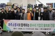 코리아타임뉴스 김태훈 기자 | 파주소방서는 3월 11일 오후 2시 파주시 광탄면 분수리 공장 밀집지역 관계자를 대상으로 안전점검과 간담회를 실시했다. 이날 간담회에는 김명찬 파주소방서장과 예방대책팀장, 광탄119안전센터장 등 소방 관계자, 분수리 기업인 협의회 관계자들이 참석해 공장 밀집지역 화재예방 방안을 논의했다. 분수리 자생산업단지는 약 1.07㎢ 규모에 260여 개 사업장이 밀집해있으며. 약 2천여 명의 근로자가 근무하고 있어 평소 화재예방과 초기 대응체계 강화가 중요한 곳이다. 이에 따라 소방서는 관계자와의 소통을 바탕으로 현장 중심 예방활동을 이어가고 있다. 이날 간담회에서는 산업단지 일반현황과 주요 화재 위험요인을 공유하고, 공장 밀집지역의 특성을 반영한 화재예방 방안을 논의했다. 이후 공단 일대 현지 시찰을 통해 주요 위험요소를 직접 확인하고, 화재 피해 저감 방안을 모색했다. 또 기업 관계자들에게 소화기와 단독경보형감지기 사용법, 전기화재 주의사항, 콘센트 화재 방지 스티커 활용법 등을 안내하고, 파주 관내 기업 대상 오픈채팅방 운영을 소개하며 화재예방 정보 전달 체계도 함께 설명했다. 김명찬