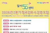 코리아타임뉴스 노승선 기자 | 대구 달서구는 50플러스세대의 역량 강화와 자기계발을 지원하기 위해‘2026년 2분기 달서50플러스센터 정규강좌’수강생을 3월 16일부터 25일까지 선착순 모집한다. 달서50플러스센터는 50~64세 중장년층이 제2의 인생을 준비할 수 있도록 다양한 평생교육 프로그램을 분기별로 운영하고 있다. 이번 2분기 강좌는 자격증, 취·창업, 디지털, 어학, 음악·미술 등 9개 분야 총 27개 과정으로 구성된다. 교육은 2026년 4월 13일부터 6월 26일까지 강좌별 최대 10주 과정으로 운영되며, 50플러스세대를 위한 창업 특강과 스트레스 관리 기획특강도 함께 진행될 예정이다. 신청 대상은 주민등록상 달서구에 거주하는 50~64세 주민이며, 수강료는 무료이다. 수강 신청은 인터넷 접수 또는 전화 접수로 가능하며, 자세한 내용은 달서구청 홈페이지 통합예약 시스템을 확인하거나 달서50플러스센터로 문의하면 된다. 이태훈 달서구청장은 “자격증 취득과 취·창업 등 다양한 교육 프로그램을 통해 50플러스세대가 제2의 인생을 스스로 설계하고 새로운 활력을 찾을 수