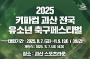 코리아타임뉴스 박찬식 기자 | 충북 괴산군은 오는 11월 7일부터 9일까지 3일간 괴산스포츠타운과 청소년수련원 축구장에서 ‘2025 자연울림괴산 전국 유소년축구대회’를 개최한다고 30일 밝혔다. 이번 대회는 (사)한국유소년축구협회와 괴산군체육회가 공동 주최하고, (사)한국유소년축구협회 및 괴산군축구협회가 주관한다. 전국 각지에서 총 70개 팀, 선수 및 임원, 학부모 등 2,000여 명이 참가할 예정이다. 특히 7일 오후 2시에는 괴산스포츠타운 준공식과 함께 개막식이 열리며, 개막 이후 첫 경기로는 괴산군 대표팀인 강호FC가 출전해 대회의 시작을 알린다. 경기는 학년별로 나뉘어 진행된다. 초등 1~3학년부는 6인제, 4~6학년부는 8인제 방식으로 운영되며, 경기의 공정성과 안전성을 확보하기 위해 전문 심판진과 운영 요원이 배치된다. 대회 우승팀에게는 필리핀 뉴클락시티에서 열리는 국제대회 및 동계 해외전지훈련 무상 참가 자격이 주어지며, 이를 통해 선수들이 국제무대 경험을 쌓고 기량을 향상시킬 수 있을 것으로 기대된다. 또한, 이번 대회는 단순한 스포츠 행사를 넘어 지역경제