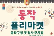 코리아타임뉴스 기동취재팀 | 동작구가 오는 11월 1일 오전 10시부터 오후 5시까지 구청 옛 청사 주차장(노량진역 5번 출구)에서 ‘2025 추억과 나눔이 오가는 동작 가을장터’를 연다고 밝혔다. 이번 행사는 주민과 단체가 직접 참여하는 ‘플리마켓’과 김장철 맞이 ‘직거래장터’를 한자리에서 즐길 수 있도록 기획됐다. 먼저 플리마켓은 약 30개 부스에서 의류, 도서, 소품 등 다양한 중고 물품을 판매하며 일상 속 자원순환 문화를 실천하는 장으로 마련된다. 직거래장터에서는 자매결연 도시 등에서 들여온 김장철 필수 품목(배추, 무, 고춧가루 등)과 지역특산물이 시중가보다 최대 33% 저렴하게 판매된다. ▲축산물 타임세일(11시·13시·15시) ▲선착순 증정품 지급 ▲당일 배달서비스(박스 단위, 관내 한정) ▲칼갈이 부스(인당 2개, 개당 100원) 등 다양한 이벤트도 진행된다. 아울러 주민들이 즐길 수 있는 ‘체험 프로그램(한지 무드등·편백 향낭 만들기 등)’과 구청 직원이 참여하는 ‘사랑 나눔 바자회’도 운영된다. 바자회 수익금은 동작복지재단 등에 후원금으로 활용될 예정이다. 이와 함께