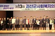 코리아타임뉴스 박찬식 기자 | 충북 괴산군은 29일 괴산군 문화예술회관에서 ‘제13회 괴산군 사회복지의 날 기념행사’를 개최했다고 밝혔다. 이번 행사는 괴산군사회복지협의회(회장 고명성) 주관으로 열렸으며, 송인헌 괴산군수를 비롯한 사회복지시설 종사자 등 200여 명이 참석한 가운데 사회복지인의 노고를 격려하고 화합을 다지는 자리로 마련됐다. 행사는 장연지역아동센터 합창단의 식전공연을 시작으로, 괴산군사회복지협의회 회장 이·취임식, 유공자 표창, 인사말, 퍼포먼스 순으로 진행됐다. 이날 이·취임식에서는 최은묵 전 회장에 이어 고명성 신임 회장이 취임했으며, 유공자 표창 수여식에서는 지역 사회복지 증진에 기여한 12명이 표창을 받았다. △군수 표창은 배기만(괴산지역자활센터), 이정자(성제노의집), 심서경(괴산재가복지센터), 이충정(괴산군노인복지관), 안미경(청천재활원), 천병주(수달지역아동센터), 이봉우(햇살재가복지센터), 이정민(괴산군 가족행복과) 등 8명이 수상했다. △군의장 표창은 신미경(괴산지역자활센터), 이만형(청천재활원) 등 2명, △괴산군사회복지협의회장 표창은 조경옥(청주사랑나