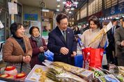 코리아타임뉴스 이아름 기자 | 이재명 대통령과 김혜경 여사는 오늘 낮, 설 명절을 앞두고 충북 충주시에 위치한 무학시장을 찾아 지역 세밑 물가를 점검하고 상인들을 만나 현장 의견을 청취했다. 무학시장은 지난 1978년 노점상들의 정착을 위해 개설된 전통시장이며, 이번 방문은 설 민심을 청취하기 위한 민생 행보의 일환이다. 이 대통령과 김 여사는 시장 내 여러 상점을 들러 “새해 복 많이 받으세요”라며 인사를 했고, 상인과 시민들은 환호와 박수로 이 대통령 부부를 맞았다. 이 대통령 부부에게 더덕을 판매한 상인은 “덕분에 마수걸이를 한다”며 “오늘 장사가 잘될 것 같다”고 말해 웃음을 자아냈다. 다른 상인들도 “힘나게 해주셔서 감사하다”, “너무 고생 많으시다”며 인사를 전했다. 이 대통령 부부는 황태포, 시금치, 곶감과 깐밤 등 제수용품과 먹거리를 구입했고 백도라지, 마른 멸치, 배추전 등을 즉석에서 맛보기도 했다. 이 대통령 부부는 온누리상품권과 현금으로 결제했다. 김 여사가 물건을 고르는 사이 이 대통령은 상인들에게 “장사는 잘 되느냐”, “곧 설인데 어떠시냐”고 물었다. 정육점 사