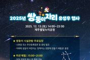코리아타임뉴스 오영주 기자 | 제주별빛누리공원은 12월 13일 ‘2025 쌍둥이자리 유성우행사’를 개최한다. 쌍둥이자리 유성우는 매년 12월 소행성 3200파에톤(Phaethon)의 파편이 지구 대기와 충돌하며 많은 별똥별이 보이는 현상을 말한다. 올해는 12월 14일 오후 4시 21분경이 극대기로 전날인 13일 밤에 눈으로 관측하기 좋을 것으로 예상된다. 특별히 이번 행사에서는 쌍둥이임을 확인할 수 있는 신분증, 주민등록등본 등을 제시하면 제주별빛누리공원 입장료가 면제된다. 당사자가 미취학 어린이일 경우에는 별도 만들기 체험권도 추가로 제공해 가족 단위 방문객의 참여를 독려할 예정이다. 실내 프로그램으로는 어린이들이 과학을 쉽고 재미있게 접할 수 있도록 구성한 ‘과학 마술 공연’이 오후 4시와 7시 두 차례 진행된다. 참여를 원하는 도민과 관광객은 12월 5일 오후 7시부터 제주별빛누리공원 누리집을 통해 사전 신청할 수 있으며, 참가비는 1인당 1,000원이다. 또한 당일 입장권을 제시하면 누구나 참여할 수 있는 ‘미션 체험’ 프로그램이 오후 3시부터 밤 9시까지 상시 운영된다. 참가