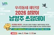 코리아타임뉴스 경기취재본부 | 남양주시는 10일부터 22일까지 시 전역에서 ‘설맞이 우리동네 새단장 남양주 쓰담데이 집중 추진기간’을 운영한다고 밝혔다. 이번 집중 추진은 설 명절을 앞두고 생활권 주변 환경을 정비하고 시민이 일상 속에서 실천하는 환경정화 활동을 확산하기 위해 마련됐다. ‘남양주 쓰담데이’는 시가 운영하는 대표적인 시민참여형 환경정화 프로그램이다. 특히 이번 쓰담데이는 행정안전부가 추진하는 전국 단위 환경정화 캠페인 ‘우리동네 새단장’과 연계해 추진한다. 지역별·단체별 자율 참여를 통해 공동체 중심의 환경 개선 활동을 확산하는 데 의미를 둔다. 2026년 현재 쓰담데이에는 약 5,200명과 277개 단체가 참여한다. △환경보호단체 △지역사회단체 △우리아파트봉사단 △상인회 등 다양한 주체가 정기적인 활동을 이어가고 있다. 시는 이번 집중 추진기간을 통해 명절 전 도시 환경을 정비하고, 시민 주도의 환경보전 실천 분위기를 확산시킬 방침이다. 이후에도 시민 중심의 자율적인 마을 단위 쓰담데이를 위한 행정적 지원을 지속할 계획이다. 쓰담데이 참여를 희망하는 시민은 남양주시 자원