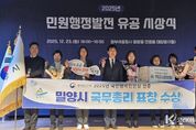 코리아타임뉴스 경남취재본부 | 밀양시는 23일 정부세종청사에서 열린 ‘2025년 민원행정발전 유공 시상식’에서 국민행복민원실 우수기관으로 선정돼 국무총리 표창을 수상했다. 국민행복민원실은 수요자 중심의 편리하고 안전하며 효과적인 민원 환경 조성을 위해 행정안전부가 전국 지방자치단체, 교육청 등 공공기관을 대상으로 민원실 운영을 평가해 우수기관을 인증하는 제도다. 인증 기간은 2028년 12월까지 3년으로, 밀양시는 2022년 국민행복민원실 최초 인증 당시 행정안전부장관 표창을 받은 데 이어, 이번 재인증에서 국무총리 표창을 수상하며 2회 연속 민원실 운영 우수기관으로 인증받았다. 특히 민원 취약계층 배려, 민원 담당자 보호 및 지원, 민원 응대 권장 시간 설정 등 안전한 민원 환경 구축에서 좋은 평가를 받았다. 밀양시 관계자는 “이번 국민행복민원실 재인증과 국무총리 표창 수상은 민원 환경 개선을 위한 행정적 노력이 평가된 결과”라며 “앞으로도 시민이 편리하고 안전하게 이용할 수 있는 민원 환경 조성을 위해 노력하겠다”라고 밝혔다.
