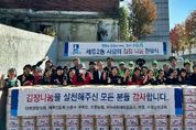 코리아타임뉴스 사회팀 | 수원시 권선구 세류2동 행정복지센터는 12일, 세류2동 행정복지센터 주차장에서 ‘사랑의 김장 나눔 행사’를 열었다. 이번 행사에는 세류2동 새마을부녀회 주관으로 마련됐으며, 주민자치회, 통장협의회를 포함한 9개 단체원 등 70여 명이 정성껏 김장김치를 담가 관내 불우이웃 약 500세대에 전달할 예정이다. 변영호 동장은 “추운 날씨에도 이웃을 위해 사랑의 김장 나눔에 참여해준 단체원들께 깊이 감사드리며 앞으로도 단체와의 협력으로 행복과 웃음이 피어나는 정겨운 세류2동 만들기에 힘쓰겠다”라고 전했다. 김재덕 새마을부녀회장은 “힘들지만 이웃을 생각하니 마음이 따뜻해졌다”라며 “앞으로도 지역사회와 함께하는 봉사활동을 꾸준히 이어가겠다”라고 말했다.
