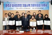 코리아타임뉴스 전북취재본부 | 완주군이 외국인 주민 지원 정책의 체계적 추진을 위해 ‘외국인주민 지원시책 자문위원회’를 구성하고, 지난 23일 중회의실에서 위촉식을 열었다. 위원장인 문성철 부군수를 비롯해 관계 공무원, 학계, 경찰, 노동청, 가족센터 등 다양한 분야의 전문가 12명이 참여한다. 자문위원회는 완주군 외국인정책팀 신설(7월)과 완주외국인지원센터 개소(8월)에 이어, 외국인 주민들의 안정적인 정착과 지역사회 통합을 위한 정책 추진을 더욱 내실 있게 하기 위해 출범했다. 위촉식에서는 완주군 외국인정책 향후 추진 방향에 대한 심도 있는 논의가 이루어졌다. 유희태 완주군수는 “완주군에는 5,190명의 외국인 주민이 함께 살아가고 있으며, 다양한 국적과 문화적 배경을 가진 이들이 우리 지역의 소중한 이웃으로 자리 잡고 있다”며 “자문위원회는 외국인 주민들의 실제 생활 속 어려움과 요구를 반영하고 지역사회와 상생을 도모하는 중요한 창구가 될 것”이라고 말했다. 이어 “위원들의 전문성과 경험을 바탕으로 외국인정책이 실효성 있고 지속가능하게 발전하길 기대하며, 외국인 주민과 지역사회가
