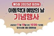 코리아타임뉴스 윤광희 기자 | 오산시는 오는 19일 ‘아동학대예방의 날’과 ‘아동학대예방주간’을 맞아 기념행사 및 온·오프라인 캠페인을 실시한다고 12일 밝혔다. 행사는 19일 오전 10시부터 12시까지 오산시청 대회의실에서 진행되며, ▲1부 아동학대예방의 날 기념식 식전공연, 유공자 표창 시상, 퍼포먼스, ▲2부 부모교육 특별강연으로 구성된다. 특별강연은 리플러스 인간연구소 박재연 소장이 ‘부모를 위한 건강한 대화방법’을 주제로 진행한다. 매년 11월 19일은 아동학대 예방과 방지에 대한 사회적 관심을 높이기 위해 제정된 법정기념일로, 오산시는 매년 기념식과 강연, 캠페인 등을 통해 아동학대 예방의 중요성을 알리는 다양한 활동을 추진해오고 있다. 시는 이달 25일까지 온라인 릴레이 캠페인도 함께 진행한다. 오산시민 누구나 SNS에 아동학대예방 메시지 또는 관련 사진을 업로드해 참여할 수 있다. 또한 11월 24일에는 시청 인근 주요 교차로에서 시민 대상 오프라인 홍보 캠페인을 실시해 아동학대 예방 인식 제고에 나설 예정이다. 박현주 아동복지과장은 “이번 행사가 아동학대 예방의 중요성을 되새기고 아