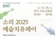 코리아타임뉴스 노승선 기자 | 여수시는 오는 11월 16일 이순신광장에서 ‘소리 2025 예술치유페어’를 개최한다. 이번 행사는 ‘소리를 느끼고, 마음을 치유하다’를 주제로 음악·악기·미술 등 다양한 감각 기반 콘텐츠를 시민이 직접 체험하며 예술적 치유를 경험할 수 있도록 마련됐다. 단순 전시 중심의 행사에서 벗어나 공연·체험·전시를 결합해 도심의 문화적 활력과 시민 정서 회복에 기여할 수 있도록 기획됐다. 특히 지역 예술기업, 공예·악기팀 등 다양한 업체가 참여해 지역 기반의 예술 치유 네트워크를 형성하고 마이스 특화전시 사업의 취지인 지역 산업 및 예술기업과의 연계를 강화하는 계기가 될 전망이다. 행사장 내 ‘소리놀이터’에는 무대와 포토존이 운영되며 시간대별 프로그램이 진행된다. 오전 오프닝 체험을 시작으로 국악과 힐링 악기가 함께하는 특별 무대가 펼쳐지며 시민이 직접 악기를 시연해보는 관객 참여형 콘텐츠도 마련된다. 김상욱 여수시 관광과장은 “이번 ‘소리 2025 예술치유페어’는 시민의 심리적 안정과 문화 향유 기회 확대는 물론 여수 마이스 특화전시사업의 방향인 지역 예술 콘텐츠