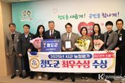 코리아타임뉴스 경북취재본부 | 청도군은 경북도에서 실시한 2025년 시군 농정평가에서 최우수기관으로 선정되어 지난 11일 경북여성가족플라자 대강당에서 열린 제30회 농업인의 날 행사에서 도지사 기관표창을 받았다. 경북도 농정평가는 22개 시·군을 대상으로 한 해 동안의 ▲농업정책▲농식품유통▲스마트농업혁신▲축산정책▲동물방역▲특수시책 등 농정업무 전반을 종합적으로 평가하는 것으로, 청도군은 이번 평가에서 ‘청도형 농업대전환 프로젝트’ 추진 성과와 스마트농업 기반 확충, 농식품 수출 확대, 지역 특화시책 발굴 등 전 부문에서 우수한 평가를 받았다. 특히 청도군은 ‘농업대전환’의 체계적 추진으로 지역 농정 혁신을 선도했다. 전담 TF 운영과 중장기 전략 수립을 통해 추진기반을 강화하고, 언론홍보와 발대식으로 대외 인지도를 높였다. 또한 농업인 의식전환 교육과 시범단지 운영으로 현장 중심의 변화를 이끌었으며, 청도반시 비상품자원화센터 운영과 납작복숭아 브랜드화 추진 등 지역 특화농업 발전에도 뚜렷한 성과를 거두었다. 김하수 청도군수는 “6년 연속 수상은 청도군의 농정정책이 현장에서 실질적인 성과를 거두고 있