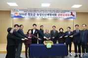 코리아타임뉴스 경북취재본부 | 청도군농업인단체협의회는 1월 13일 청도농협농산물유통센터 2층 대회의실에서 2026년 신년교례회를 개최하고, 새해 청도 농업의 발전과 농업인 상생 협력을 다짐하는 뜻깊은 시간을 가졌다. 이날 행사에는 군내 15개 농업인 단체 100여 명이 참석해 새해 인사를 나누고 청도 농업의 미래 비전에 대해 의견을 공유했다. 신년교례회는 국민의례를 시작으로 ▲ 신년 인사 ▲ 내빈 축사 ▲ 시루떡 절단 ▲ 기념촬영 순으로 진행됐으며, 참석자들은 고령화·기후변화·농업경영비 상승 등 농업 현안에 공동 대응하고 농업 경쟁력 강화를 위해 힘을 모을 것을 다짐했다. 청도군 농업인단체협의회 회장 박희수는 “2026년 변화하는 농업 환경 속에서 농업인의 역할이 더욱 중요한 한 해가 될 것”이라며 “농업인단체 간 협력을 강화하고, 청도 농업의 지속가능한 발전을 위해 앞장서겠다”고 말했다. 김동기 청도군 부군수는 “청도 농업은 농업인 여러분의 땀과 노력으로 성장해왔다”며 “앞으로도 청도 지속적인 농업 발전과 농업인 소득 증대를 위해 행정 역량을 집중하겠다”고 밝혔다.