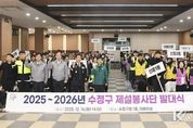 코리아타임뉴스 경기취재본부 | 성남시는 폭설에 대응하기 위해 수정, 중원, 분당 등 구별로 시민들이 참여하는 제설봉사단을 구성해 운영하고 있다고 18일 밝혔다. 이를 위해 수정구는 지난 12월 16일 오후 2시 구청 1층 대회의실에서 수정경찰서와 합동 대책회의를 하고, 제설봉사단 발대식을 개최했다. 수정구는 경찰과의 합동 대책회의 자리에서 지난 12월 4일 단시간에 집중된 폭설 당시의 현장 대응체계를 점검하고, 도로 교통혼잡과 안전사고 발생을 최소화하기 위한 기관 간 협력 방안과 대응 매뉴얼을 논의했다. 이어진 수정구 제설봉사단 발대식엔 전체 단원 1122명 가운데 100명이 참석해 폭설로 인한 주민 불편을 최소화하고 적극적인 제설 자원봉사 활동에 참여할 것을 다짐했다. 제설봉사단은 강설 시 이면도로 경사로, 보도, 육교 등 제설 취약 지역에 우선 투입된다. 전경만 수정구청장은 “제설봉사단은 제설 작업 이외에도 ‘내 집 앞, 눈 치우기’를 주변에 적극적으로 홍보해 주민들의 관심과 협조를 이끌어 내는 역할도 중요하다”면서 “민‧관‧경의 유기적인 협력을 통해 주민들이 안전하게 겨울을 날 수