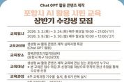 코리아타임뉴스 경북취재본부 | 포항시는 지난해 시민들로부터 큰 호응을 얻었던 ‘생성형 AI 활용 콘텐츠 제작 특강’을 올해도 정규 편성하고, 오는 23일부터 2026년도 상반기(1·2기) 수강생을 모집한다. 이번 특강은 ChatGPT를 활용한 생성형 AI를 실생활과 업무에 즉각적으로 활용할 수 있는 실질적인 학습 기회를 제공하기 위해 마련됐다. 지난해 실시된 특강이 시민들로부터 높은 관심과 만족도를 기록함에 따라, 시는 총 6기에 걸쳐 확대 운영할 계획이다. 이번 모집은 그중 상반기에 시작되는 1기와 2기를 대상으로 진행된다. 교육은 기수별로 4주 동안 주 1회(회당 2시간)씩 진행된다. 야간반인 1기는 3월 3일부터 24일까지 매주 화요일 오후 7시에 운영되며, 2기는 3월 9일부터 30일까지 매주 월요일 오전 10시에 시작된다. 교육 장소는 경북콘텐츠기업지원센터 5층이다. 포항시민이라면 누구나 신청 가능하며, 모집 인원은 기수별 20명씩 총 40명이다. 단, 더 많은 시민에게 교육 기회를 제공하기 위해 중복 접수는 불가능하다. 접수 기간은 오