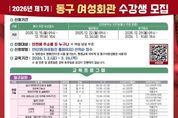 코리아타임뉴스 이아름 기자 | 인천 동구는 2026년 1월9일까지 ‘2026년 제1기 동구 여성회관 수강생’을 모집한다고 밝혔다. 2026년 1월2일부터 3개월 과정으로 진행되는 제1기 정규강좌 프로그램은 수강생들로부터 자격증 취득과 취업을 이끌어내 호평을 받은 실내인테리어(도배 및 필름) 등의 자격증 취득 프로그램과 어반스케치, 민화 그리기를 포함한 요리·공예 프로그램 등 총 26개 과정으로 운영된다. 특히 2025년 많은 수강생이 커피 바리스타 2급을 취득한 기존 커피 바리스타 강좌에 신규로 야간 강좌까지 추가되어 카페 취업이나 창업에 도움이 될 수 있도록 했다. 또한 한식 디저트 만들기 강좌와 장 담그기, 전통 헤어 강좌는 실생활 활용도가 높은 프로그램으로, 1개월 단기 특강으로 운영해 주민들이 부담 없이 참여할 수 있도록 구성했다. 일일 무료 특강으로는 일일민화그리기 특강과 커피 원데이 클래스가 준비됐다. 수강 신청은 인천 거주자를 대상(동구 주민 우선)으로 여성회관 홈페이지를 통해 선착순 접수하며, 온라인 접수에 불편을 겪는 분이나 동구사랑상품권·평생교육 바우처 사용자는 여성회