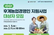코리아타임뉴스 노승선 기자 | 사천시가 오는 2월 11일까지 2026년 후계농업경영인 육성사업 대상자를 모집한다고 14일 밝혔다. 신청 자격은 사천시에 거주하는 만 18세 이상 50세 미만의 예비농업인으로, 독립 경영 경험이 10년 미만이거나 독립 경영 예정자이며, 병역을 필하거나 면제된 사람이다. 사업 신청은 처세대농림사업정보시스템(농업e지)을 통해 온라인으로 가능하며, 서류 평가와 평가 검증을 거쳐 2026년 4월 중 최종 결과가 발표될 예정이다. 후계농업경영인 육성사업은 선정된 농업인에게 최대 5억원의 융자 지원을 제공하고, 선정된 후계농의 영농 경영 및 역량강화를 위한 교육프로그램도 지원한다. 자세한 사항은 사천시 홈페이지에 게시된 시행 지침을 참고하거나, 사천시 미래농업과 인력육성팀으로 문의하면 된다. 박동식 시장은 "미래 농업을 이끌어 갈 후계농업경영인들이 본 지원사업을 적극 활용해 안정적으로 영농에 정착할 수 있도록 최선을 다해 지원하겠다"고 말했다.