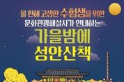 코리아타임뉴스 충북취재본부 | 청주시는 2026학년도 대학수학능력시험을 치른 수험생을 대상으로 ‘가을밤에 성안산책’ 프로그램에서 특별 이벤트를 진행한다고 12일 밝혔다. 11월 성안산책 프로그램에 참여한 수험생에게 성안길상점가에서 사용할 수 있는 상품권(5천원)을 제공하는 내용으로, 2026학년도 수능 수험표를 소지한 수험생에게 적용된다. 가을밤에 성안산책은 9~11월 매주 금요일과 토요일 오후 7시부터 8시까지 한 시간 동안 청주 원도심 문화유산 5곳을 돌며 청주시 문화관광해설사의 해설을 듣는 프로그램이다. 참가 신청은 청주여기 모바일 앱을 통해 가능하며, 사전 신청한 선착순 40명에 한해 상품권이 지급될 예정이다. 한편, 가을밤에 성안산책은 오후 7시 이후 유동 인구가 급감하는 성안길과 중앙공원 일대를 활성화하기 위해 기획됐다. 지난 10일 기준 누적 참여인원은 558명을 기록, 원도심을 대표하는 신규 야간관광 체험 콘텐츠로 자리매김하고 있다. 이현숙 관광과장은 “시험을 마친 수험생들이 가을밤 정취를 마음 편히 즐기고, 올 한해 지친 마음을 치유할 수 있는 알찬 시간이 되길 바란다”
