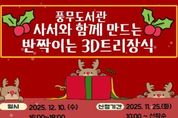 코리아타임뉴스 문화팀 | 김포시 풍무도서관에서 초등학생을 대상으로 ‘사서와 함께 만드는 반짝이는 3D트리장식’을 오는 12월 10일 오후 4시부터 6시까지 운영한다. 이번 프로그램은 수강생의 학년에 따라 제작 도구의 난이도와 창작물이 구분되며, 참여 학생의 수준에 맞춘 맞춤형 체험활동으로 운영된다. 3D펜을 활용한 제작 경험을 통해 공간·입체 감각을 향상시키는 동시에 연말 크리스마스 시즌의 특색있는 분위기를 느낄 수 있다. 특히 풍무도서관 특화담당 사서가 직접 프로그램을 진행함으로써 안전하고 체계적인 지도가 이뤄질 것이다. 참여 신청은 11월 25일 오전 10시부터 풍무도서관 홈페이지에서 가능하며, 초등학생(1~6학년) 총 12명을 선착순 모집한다.
