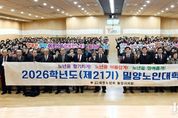 코리아타임뉴스 경남취재본부 | (사)대한노인회 밀양시지회(지회장 신준철)는 11일, 밀양시청 대강당에서 입학생 410명과 내빈들이 참석한 가운데 ‘제21기 밀양노인대학 입학식’을 성황리에 개최했다. 이날 행사는 식전 공연을 시작으로 국민의례, 입학 허가, 입학생 선서, 환영사와 축사 순으로 진행됐으며, 배움에 대한 뜨거운 열정으로 새로운 출발선에 선 어르신들을 축하하는 뜻깊은 자리로 마련됐다. 제21기 밀양노인대학은 3월부터 11월까지 9개월간 운영된다. 매월 둘째· 넷째 주 수요일(월 2회)마다 △교양강좌 △건강강좌 △웃음치료·노래교실 등 오락강좌 △현장학습 등 4개 분야의 다양한 프로그램을 통해 어르신들의 건전한 여가 선용과 평생학습 기회를 제공할 예정이다. 특히 올해는 수강생 모집을 시작한 지 단 2일 만에 정원 410명이 조기 마감될 정도로 어르신들의 높은 관심을 끌었다. 이는 배움에 대한 어르신들의 열정과 밀양노인대학의 내실 있는 운영 성과가 맞물린 결과로 풀이된다. 신준철 지회장은 “제21기 입학생 여러분의 새로운 출발을 진심으로 축하드린다”며 “시대 변화에 맞는 알찬 프로그램을 준비해