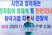 코리아타임뉴스 경기취재본부 | 신상진 성남시장은 12일 오후 2시 30분 탄천변에서 열린 ‘명품 탄천지킴이 발대식’에 참석했다. 민·관·기업 협력을 통한 지속가능한 탄천 관리 체계 구축을 위해 마련된 이번 발대식에는 신 시장을 비롯해 ESG활성화위원회 관계자, ESG 참여기업 관계자, 명품탄천지킴이 등 300여 명이 함께했다. 이날 행사는 환경지킴이 50명에 대한 위촉장 수여, KT 및 한화비전 ESG 탄천오너십 기업 지정서 전달, 시장 인사말, 기념촬영, 탄천 정화활동 순으로 진행됐다. 신 시장은 인사말을 통해 “시민들의 소중한 휴식처를 관리하고 가꾸는 일은 행정의 힘만으로는 불가능하다”며 “여러분과 함께 탄천을 지키기 위해 오늘 발대식을 마련했다”고 말했다. 이어 “시장 취임 후 탄천 전 구간의 퇴적토를 단계적으로 준설해 유량 흐름을 원활히 하고 수질을 개선했다”며 “앞으로도 지킴이 여러분과 함께 시민들이 휴식하고 다양한 생활체육을 즐길 수 있는 우리 모두의 명품 탄천으로 가꿔나가겠다”고 강조했다. 성남시는 지난 9월 ‘ESG 특별시 성남’ 비전을 선포하고, 탄천 정화 활동을 포함한