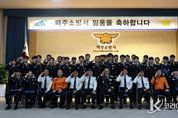 코리아타임뉴스 김태훈 기자 | 파주소방서는 오는 12일 오전, 본서 3층 대회의실에서 타 소방서에서 전입한 소방공무원 41명에 대한 임용신고식을 열었다. 화재, 구조, 구급, 행정 등 다양한 분야에서 새롭게 합류한 전입자들은 이날 임용장을 받고, 파주소방서의 가족으로 첫 발을 내디뎠다. 임용식은 서장 주관의 임용장 수여를 시작으로, 보안 및 보건관리 교육, 조직문화 안내 등으로 진행됐다. 각자의 위치는 달라도 ‘시민의 안전’을 향한 마음은 하나라는 것을 나누는 뜻깊은 시간이었다. 김명찬 파주소방서장은 “이제 여러분은 파주소방서라는 하나의 이름 아래 함께 걷는 동료”라며 ““소방공무원으로서의 긍지와 사명을 가슴에 새기고, 시민의 생명을 지키는 길에 함께하길 바란다”고 전했다. 전입자들은 앞으로 파주소방서의 일원으로서, 각자의 위치에서 사명감과 책임감을 갖고 시민의 생명과 안전을 지키는 데 힘을 보탤 예정이다.