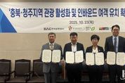 코리아타임뉴스 충북취재본부 | 청주시는 한국공항공사 청주공항, 한국관광공사 세종충북지사, 충북문화재단과 23일 청주국제공항에서 청주공항 중국 노선 활성화 및 인바운드(외국인의 국내 관광) 관광객 유치 확대를 위한 업무 협약을 체결했다. 이번 협약은 중국 단체 관광객의 무비자 입국 한시 허용*을 계기로, 각 기관이 보유한 전문성과 네트워크를 활용해 관광과 항공의 상생 활성화를 강화하기 위해 마련됐다. 4개 기관은 최근 변화하는 방한 외국인 관광 추세에 맞춰 중국, 일본, 대만 등 청주공항 노선과 연계 인바운드 관광객 유치를 위한 실질적 협력을 강화하기 위해 긴밀히 협력할 예정이다. 특히 이번 중국인 유학생과 연계한 VFR* 관광 활성화로 안정적인 인바운드 수요를 창출하기 위한 팸투어 등 다양한 사업을 추진할 예정이다. 정상미 시 문화체육관광국장은 “이번 협약을 계기로 청주공항을 통한 중국 방한 관광객들이 예전 수준으로 회복되는 출발점일 되기를 희망한다”며 “각 기관이 긴밀한 협력을 통해 더 많은 관광객이 찾고 다시 찾고 싶은 도시 청주가 될 수 있도록 노력하겠다”고 말했다. 한편, 현재