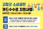 코리아타임뉴스 전북취재본부 | 고창군이 관내 소상공인의 경영 부담 완화를 위해 오는 4월1일부터 예산 소진 시까지 ‘2026년 소상공인 카드수수료 지원사업’을 본격 추진한다고 밝혔다. 이번 사업은 전년도 연매출 3억원 이하 고창군 소재 소상공인을 대상으로 하며, 카드 매출액의 0.4%에 해당하는 카드수수료를 최대 50만원까지 지원한다. 특히, 해당 사업은 도비와 군비를 포함해 업체당 최대 30만원까지 지원되는 가운데, 고창군은 군비 20만원을 추가로 투입해 도내 타 시·군보다 확대된 최대 50만원까지 지원한다. 최근 중동 정세 등 대외 경제 불안에 따른 경기 침체와 소비 위축으로 어려움을 겪는 지역 소상공인의 경영 여건을 고려해 전년보다 1개월 앞당겨 조기 시행하며, 실질적인 경영 부담 완화에 중점을 두었다. 신청을 희망하는 소상공인은 사업장 소재지 읍·면 주민행복센터를 방문해 신청할 수 있으며, 자세한 사항은 고창군청 홈페이지 공고문을 통해 확인할 수 있다. 고창군수는 “소상공인은 지역경제의 근간이고, 이들의 회복이 곧 지역의 활력이다”며, “이번 지원사업이 경기침체로 어려움을 겪는