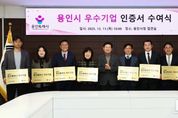 코리아타임뉴스 경제팀 | 용인특례시는 11일 시청 접견실에서 ‘2025년 용인시 우수기업 인증제’ 심의 결과 선정된 ‘올해의 우수기업’ 10개 사에 인증서를 전달했다. 이상일 용인특례시장은 이들 기업 대표와 임직원들을 만나 축하와 격려 인사를 나누고 우수기업 인증서와 현판을 전달했다. 이상일 시장은 “우리 경제가 어려운 가운데서도 기업 활동을 잘 해주셔서 우수기업으로 선정된 것을 축하드린다”며 “각자 분야에서 그동안 많은 노하우를 쌓아왔기에 경제가 어려운 가운데서도 성과를 냈고, 우리 지역 경제에도 큰 보탬이 돼 주셔서 감사드린다”고 말했다. 이 시장은 “기업 활동으로 한 가족의 가장은 힘을 얻어 가정을 잘 꾸려갈 수 있고, 신규 일자리를 찾는 사람에게는 희망을 주셨다”며 “기업인들이 활동하실 수 있도록 환경을 잘 개선해 나갈 것”이라고 했다. 시는 매년 경영 실적, 기술·품질 경쟁력, 지역사회 기여도 등 다양한 지표를 종합 평가해 지역경제 발전에 기여한 중소기업을 우수기업으로 인증하고 있다. 올해 선정된 기업은 ▲㈜대성티엠씨 ▲신명이엔씨㈜ ▲주식회사 에이드로 ▲㈜에이치에스씨엠티 ▲주식