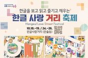코리아타임뉴스 오영주 기자 | 세종시문화관광재단은 오는 10월 18일부터 26일까지 한솔동 한글사랑거리(첫마을 정류장 인근) 일원에서 ‘한글 사랑거리 축제’를 개최한다. 이번 축제는 한글문화도시 세종의 상징공간인 ‘한글 사랑거리’를 중심으로 시민이 한글을 보고, 읽고, 즐기며 한글문화의 가치를 체험하는 문화축제로 마련됐다. 특히 한국영상대학교, 한솔동 상인회 등 지역기관이 함께 참여해 한글문화를 지역상권과 연결하고 세종만의 한글문화 네트워크를 확장할 전망이다. 행사는 10월 18~19일과 24~26일, 총 5일간 진행되며, ‘읽고·보고·즐기고·채우는’ 네 가지 주제를 중심으로 전시·공연·체험·먹거리가 어우러진 다채로운 프로그램으로 시민들을 맞이한다. 먼저 한글을 ‘읽고’ 즐길 수 있는 테마에서는, 한글 이야기 공모전 선정작 5편과 삽화·캐릭터 디지털 감상, 거리에서 펼쳐지는 자율 독서로 한글의 즐거움을 느껴볼 수 있다. 거리 곳곳에서는 시민들이 ‘보고’ 즐길 수 있는 다양한 공연이 이어진다. 18일에는 한글 컬러마임 퍼포먼스(13시), 세종거리예술가 공연(17시)이 펼쳐지고 19일·25일·26일에는