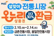 코리아타임뉴스 윤광희 기자 | 파주시는 2026년 설 명절을 맞아 고물가로 인한 시민들의 가계 부담을 덜고 지역 전통시장 활성화를 도모하기 위해 ‘설맞이 농축산물 온누리상품권 환급 행사’를 실시한다. 이번 행사는 농림축산식품부가 주관하는 ‘농축산물 할인지원’사업의 일환으로, 본격적인 제수용품 구매 기간인ق월 10일부터 14일까지 5일간 관내 전통시장 2곳(봉일천전통시장, 금촌전통시장)에서 진행된다. 행사 기간 동안 참여 점포에서 국산 농축산물을 구매한 고객은 구매 금액에 따라 1만 원 또는 2만 원 상당의 온누리상품권을 환급받을 수 있다. 환급 기준은 ▲구매 금액이 3만 4천원 이상 6만 7천 원 미만일 경우 1만 원 ▲6만 7천 원 이상일 경우 2만 원이며, 환급 한도는 1인당 최대 2만 원이다. 단, 예산 소진 시 행사는 조기 종료될 수 있다. 환급을 희망하는 고객은 당일 구매 영수증과 신분증을 지참해 각 시장 내에 마련된 지정 환급처를 방문하면 된다. 환급 대상 품목은 국산 농산물 및 축산물이며, 수입산 농축산물이나 법인카드 결제 내역, 제로페이 모바일 상품권 결제 내역 등은 환급 대상에서 제