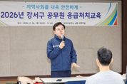코리아타임뉴스 윤광희 기자 | 서울 강서구는 26일 오전 10시 강서보건소에서 응급 시 주민의 생명을 구하기 위한 ‘응급처치 실전 교육’을 실시했다. ‘2025년 한국 심폐소생술 가이드라인’에 따르면, 구급대가 이송한 병원 밖 심정지 환자는 2008년 2만 1,905명에서 2024년 3만 3,034명으로 크게 증가했다. 심정지 발생 후 4~5분이 지나면 산소 부족으로 뇌 손상이 시작되기 때문에 구급대 도착 전 목격자의 신속한 대응이 매우 중요하다. 이번 교육은 구청 직원 82명을 대상으로 응급처치의 중요성을 인식하고, 일상생활이나 민원 현장에서 발생할 수 있는 심정지 등 응급상황에 신속하고 정확하게 대응할 수 있는 역량을 강화하기 위해 마련됐다. 특히 최근 발표된 ‘2025년 한국 심폐소생술 가이드라인’의 개정 내용을 반영해 교육의 정확성을 높였다. 최신 지침에 따른 심폐소생술 절차와 자동심장충격기(AED) 사용법 등을 포함해 직원들이 실제 현장에서 당황하지 않고 효과적으로 대처할 수 있도록 구성했다. 교육에는 이대목동병원 이재희 응급의학과 교수를 초빙해 심폐소생술 및 자동심장충격기 사용법 등 주요