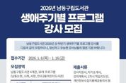 코리아타임뉴스 이아름 기자 | 인천시 남동구 구립도서관은 3~12월까지 운영하는 ‘2026년 상·하반기 생애주기별 프로그램’에 함께 할 프로그램 강사를 공개 모집한다고 12일 밝혔다. 올해 구립도서관 4개관(남동논현, 소래, 서창, 만수2동어린이도서관)의 생애주기별 프로그램은 10개 분야로 구성돼 운영될 예정이다. 강사 모집은 유아·아동 대상의 영어·한국사·생태·미술·전래놀이·경제 등 8개 강좌와 성인 대상의 책 놀이·영어독서 지도 교육 등 2개 강좌를 대상으로 한다. 관련 분야 전공자, 교육과정 이수자, 자격증 소지자, 강의 경력자라면 누구나 강사로 지원할 수 있다. 지원자는 강사지원서·강의계획서·자기소개서 등 서류를 준비해 1월 16일까지 남동논현도서관 또는 서창도서관에 방문하거나 이메일을 통해 제출하면 된다. 구는 매년 강사 공개 모집을 통해 여러 분야의 우수한 강사를 발굴·선발하여 생애주기별 프로그램을 진행하며, 지역주민의 교육적 삶의 질 향상과 독서문화 활성화를 통해 지역 내 독서문화 진흥을 도모할 수 있기를 기대하고 있다. 자세한 사항은 남동구립도서관 홈페이지 또