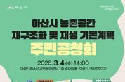 코리아타임뉴스 김택호 기자 | 아산시는 '농촌공간 재구조화 및 재생 기본계획' 수립과 관련해 지역 주민과 관계 전문가의 의견을 수렴하기 위한 주민공청회를 오는 3월 4일 오후 2시, 아산시 청소년교육문화센터 1층 스마트홀(시민로 500)에서 개최한다. 이번 기본계획은 아산시 2개 읍·9개 면을 공간적 범위로 하고, 2026년부터 2035년까지 10년간을 계획기간으로 수립되는 법정계획이다. 농촌공간의 체계적 기능 재편과 생활여건 개선을 목표로, 지역 특성을 반영한 중장기 발전 방향을 제시할 예정이다. 공청회에서는 △계획 개요 △현황 및 여건 분석 △재구조화 및 재생 기본구상 △부문별 계획 등을 발표하고, 토론과 질의응답을 통해 주민 및 전문가 의견을 폭넓게 수렴할 계획이다. 시는 공청회에서 제시된 의견을 종합해 아산시 농촌공간정책심의회 심의와 농림축산식품부 및 충청남도와 협의 과정에 반영할 방침이다. 기본계획(안)에 의견이 있는 주민은 3월 13일 오후 6시까지 전자우편 또는 우편으로 의견서를 제출하거나, 공청회에 참석해 질의응답 시간에 직접 의견을 제시할 수 있다.