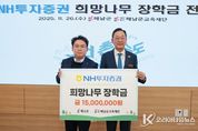 코리아타임뉴스 노승선 기자 | NH투자증권에서 인재육성을 위한‘희망나무 장학금’1,500만원을 해남군에 전달했다. 해남군청에서 진행된 전달식에는 명현관 군수, NH투자증권 임철순 ESG본부장, 농협중앙회 하정필 해남군지부장과 지역 농협장들이 함께했다. 해남군은 전달받은 장학금을 해남군교육재단을 통해 지역 내 다문화가정, 조손가정, 한부모가정 등 저소득 우수 고등학생 10명을 선발, 1인당 150만원씩 지급할 계획이다. 지난 2005년부터 전국 우수 고교생에 장학금을 지원해온 NH투자증권은 올해부터는 농촌지역 지자체에 직접 장학금을 지원하는 방식으로 제도를 개편했다. NH투자증권 임철순 ESG본부장은“희망나무 장학금은 농촌지역 학생들이 희망과 용기를 갖고 학업에 매진하여 꿈을 이룰 수 있도록 돕기 위한 것”이라며“해남군과의 협력을 통해 선발될 학생들이 꿈을 향해 나아갈 수 있도록 앞으로도 응원하겠다”고 밝혔다. 명현관 군수는“NH투자증권의 지역 인재 양성을 위한 관심과 지원에 진심으로 감사드린다”며“이번에 전달받은 장학금을 통해 어려운 환경 속에서도 학업에 정진하는 우리 해남군 학생들에게