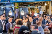 코리아타임뉴스 이아름 기자 | 이재명 대통령과 김혜경 여사는 오늘 오전 제66주년 3·15의거 기념식에 참석한 뒤 경상남도 창원시 성산구에 위치한 반송시장을 깜짝 방문해 물가를 점검하고 민심을 청취했다. 반송시장은 1988년 개장해 지역민들의 삶과 함께해온 곳으로, 저렴하고 정감 있는 칼국수 골목으로도 유명하다. 이재명 대통령은 더불어민주당 대표 시절이던 2024년 3월에도 반송시장을 방문한 바 있다. 시장에 깜짝 등장한 이재명 대통령 부부를 상인들과 주민들은 환호와 박수로 반겼다. 시장 곳곳에서는 “진짜 대한민국”, “사랑합니다“, ”존경합니다“, ”응원합니다“, “건강하세요”, “순방 때 너무 잘하셨습니다” 등 다양한 응원의 목소리가 이어졌다. 이재명 대통령 부부는 일일이 악수와 하이파이브를 하며 인사를 건넸고, 아이들에게는 허리를 숙여 눈을 맞추며 반가움을 전하기도 했다. 한 시민이 “조금 전 TV로 3·15의거 기념식을 봤는데 어떻게 벌써 여기 오셨느냐”고 묻자, 이재명 대통령은 “날아왔다”고 농담을 건네며 현장에 웃음을 자아내기도 했다. 이재명 대통령 부부는 딸기,