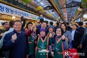 코리아타임뉴스 이아름 기자 | 이재명 대통령은 30일 오후 제주 타운홀미팅 '제주의 마음을 듣다' 종료 후, 김혜경 여사와 함께 1박 2일 제주 일정의 마지막 일정으로 동문시장을 방문했다. 동문시장은 제주시 도심에 위치한 대표적인 전통시장으로, 대통령 부부의 방문 소식에 상인들과 방문객들은 놀라움 속에 환호와 박수로 이들을 맞이했다. 입구에 서 있던 한 외국인 관광객은 어디서 왔냐는 이 대통령의 질문에 “오스트레일리아”고 답하기도 했다. 이 대통령 부부는 셀카촬영과 악수를 이어가며 과일모찌 가게에 들러 온누리상품권으로 한라봉모찌와 딸기모찌를 구입해 즉석에서 강유정 대변인, 하정우 수석 등과 함께 시식했다. 이동 내내 이어지는 셀카요청에도 이 대통령 부부는 반갑게 응했다. 그러자 시장을 찾은 많은 도민들은 이동 중인 이 대통령 부부를 향해 "사랑해요", "와 대박", "화이팅"을 외치는 소리로 화답했다. 이 대통령은 특히 어린이들의 사진 요청에 적극적으로 답했다. "애기 있어요"라는 소리가 들리면 발걸음을 멈추고 아이들과 하이파이브를 하거나 반갑게 셀카를 찍었다. 또한 강아지