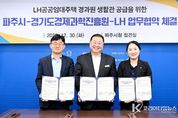 코리아타임뉴스 박찬식 기자 | 파주시는 30일 경기도경제과학진흥원, 한국토지주택공사 경기북부지역본부와 경과원 파주시 이전에 따른 엘에이치(LH) 공공임대주택 생활관 지원을 위한 업무협약을 체결했다고 밝혔다. 이번 협약은 경과원의 단계적 이전에 앞서 직원들에게 안정적인 정주환경을 제공함으로써 거주지 이전에 따르는 비용 부담을 최소화하기 위한 세 기관간 협력을 강화하는 차원에서 추진됐다. 협약에 따라 한국토지주택공사는 운정신도시 내 공공임대주택 중 보유 공실 일부를 생활관 용도로 활용할 수 있도록 공급 방안을 검토하고, 파주시는 입주 절차와 행정적 지원을 담당한다. 경과원은 대상자 선정과 운영 관리 등 내부 절차를 마련해 실제 입주가 차질 없이 진행될 수 있도록 준비할 계획이다. 김경일 파주시장은 “이번 협약이 파주에 둥지를 틀게 될 경과원 직원들이 걱정 없이 생활할 수 있는 실질적인 지원이 될 것으로 기대한다”라고 말했다. 김현곤 경기도경제과학진흥원장은 “직원들의 주거 부담을 줄이는 것은 이전 성공의 핵심 요소”라며 “세 기관이 함께 만들어가는 협력체계가 앞으로도 좋은 모델이 되길 바란다”라고 전했다.