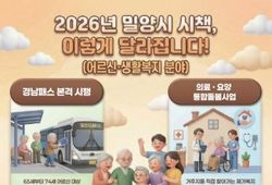 코리아타임뉴스 윤경수 기자 | 밀양시는 초고령사회 어르신들의 삶의 질을 실질적으로 높이기 위해 2026년 복지 예산을 생활 밀착형 사업에 집중 투입한다. 단순히 혜택을 늘리는 것을 넘어, 어르신들의 ‘자유로운 이동’과 ‘안전한 거주’, ‘활기찬 소통’이 유기적으로 이어지는 촘촘한 복지 그물망을 구축하는 것이 핵심이다. ▲ 가벼워진 발걸음, ‘경남패스’로 여는 활기찬 외출 먼저, 어르신들의 사회활동 참여를 가로막는 이동의 제약을 대폭 낮춘다. 새해부터 혜택이 확대되는 ‘경남패스(경상남도 대중교통비 환급)’는 65세 이상 어르신들의 경제적 부담을 덜어주는 효자 정책이다. 65세부터 74세 어르신이 대중교통을 이용할 경우 이용 요금의 30%를 환급하며, 일정 금액 이상 이용 시 초과분에 대해서는 100% 환급 혜택을 제공한다. 이는 어르신들이 비용 걱정 없이 병원 진료나 문화 활동을 위해 시내외를 자유롭게 오갈 수 있도록 돕는 ‘교통 기본권’ 강화의 일환이다. ▲ 집 안의 불편 덜고 안전 채우는 ‘고쳐DREAM’과 ‘통합돌봄’ 자유로운 외출만큼이나 중요한 ‘안전한 거주’를 위한 정책도 입체적으로 전개된다. 75세 이