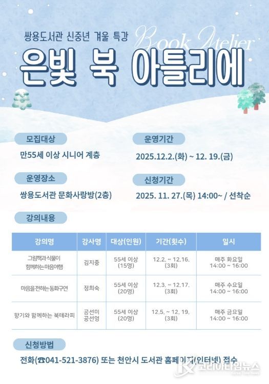코리아타임뉴스 김택호 기자 | 천안시 쌍용도서관은 내달 신중년과 함께하는 겨울 특강 ‘은빛 북 아틀리에’를 운영한다고 26일 밝혔다.