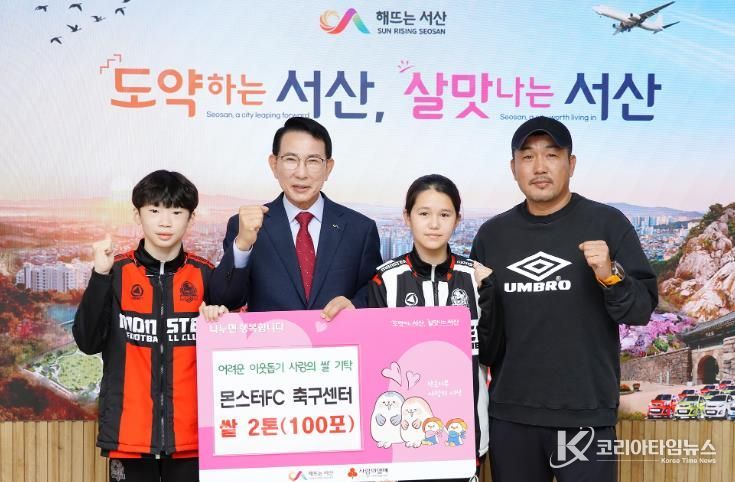 이날 몬스터FC 축구센터는 600만 원 상당의 쌀 2톤(100포, 1포당 20㎏), 한국방송통신대학교 서산태안학생회는 어려운 이웃돕기 성금 100만 원을 서산시에 전달했다.