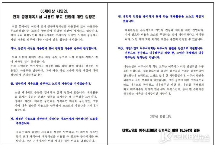 이번 조례 개정안은 65세 이상 시민과 장애인에게 공공체육시설 사용료를 전액 무료화하는 내용을 담고 있었으나, 대한노인회 여주시지회는 입장문을 통해 전면 무료화보다는 현행 감면 제도의 유지가 바람직하다는 분명한 입장을 밝혔다.